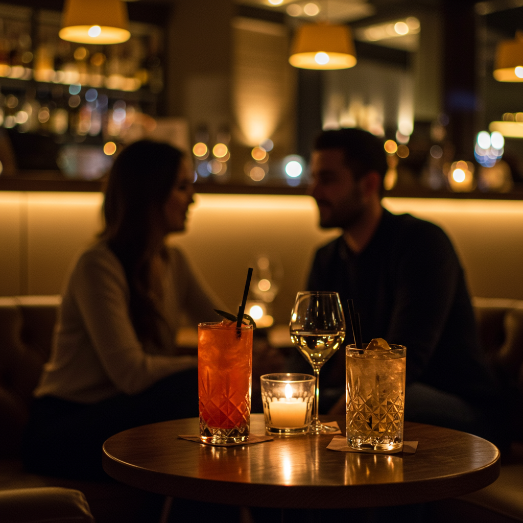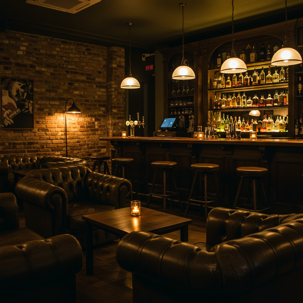 따뜻하고 편안한 술집 내부, 부드럽고 은은한 조명, 깊은 가죽 안락의자, 나무 카운터와 술이 가득 찬 선반. 환영하는 듯한 편안한 분위기에 초점을 맞춥니다.